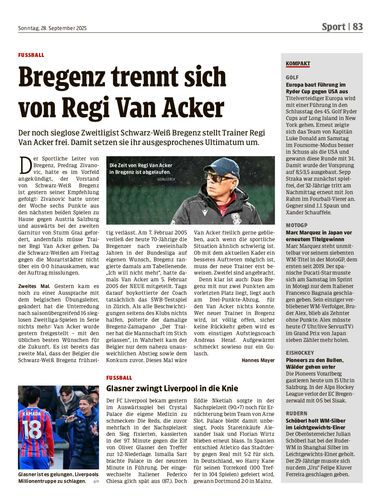 Der noch sieglose Zweitligist Schwarz-Weiß Bregenz stellt Trainer Regi Van Acker frei. Damit setzen sie ihr ausgesprochenes Ultimatum um.
