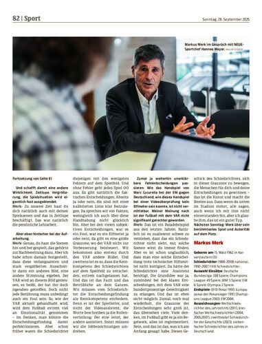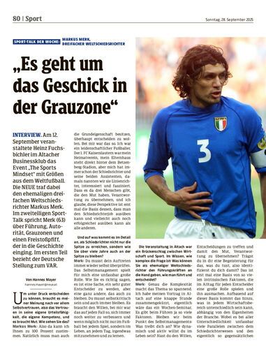 Interview. Am 12. September veranstaltete Heinz Fuchsbichler im Altacher Businessklub das Event „The Sports Mindset“ mit Größen aus dem Weltfußball. Die NEUE traf dabei den ehemaligen dreifachen Weltschiedsrichter Markus Merk. Im zweiteiligen Sport-Talk spricht Merk (63) über Führung, Autorität, Grauzonen und einen Freistoßpfiff, der in die Geschichte einging. Im ersten Teil bezieht der Deutsche Stellung zum VAR.