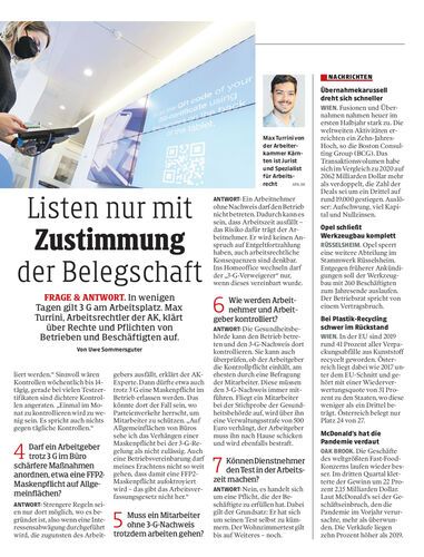 frage & Antwort. In wenigen Tagen gilt 3 G am Arbeitsplatz. Max Turrini, Arbeitsrechtler der AK, klärt über Rechte und Pflichten von Betrieben und Beschäftigten auf. Von Uwe Sommersguter