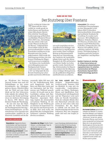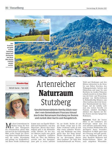 Geschichtenerzählerin Hertha Glück wandert vom Gemeindeamt Frastanz hinauf durch den Naturraum Stutzberg zur Bazora und zurück über Gurtis und Rungeletsch.