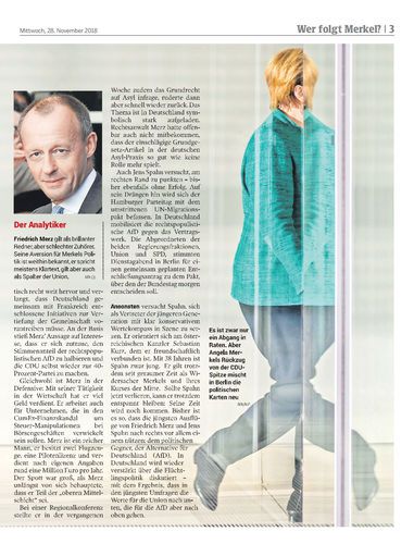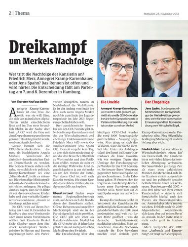 Wer tritt die Nachfolge der Kanzlerin an? Friedrich Merz, Annegret Kramp-Karrenbauer, oder Jens Spahn? Das Rennen ist offen und wird härter. Die Entscheidung fällt am Parteitag am 7. und 8. Dezember in Hamburg.