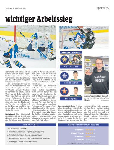 Spielbericht. Die Bulldogs gewinnen 3:2 nach Verlängerung gegen Villach. Das Siegtor erzielt Andrew Yogan auf unnachahmliche Art.