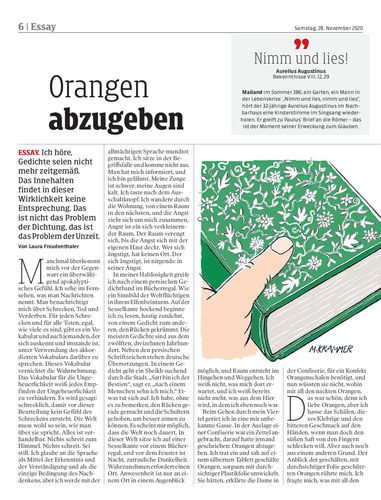 ESSAY. Ich höre, Gedichte seien nicht mehr zeitgemäß. Das Innehalten findet in dieser Wirklichkeit keine Entsprechung. Das ist nicht das Problem der Dichtung, das ist das Problem der Unzeit. Von Laura Freudenthaler
