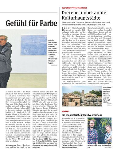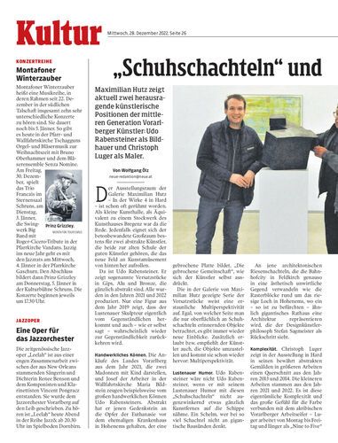 Maximilian Hutz zeigt aktuell zwei herausragende künstlerische Positionen der mittleren Generation Vorarlberger Künstler: Udo Rabensteiner als Bildhauer und Christoph Luger als Maler.