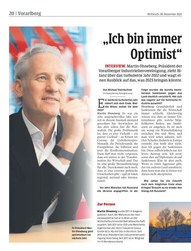 Interview. Martin Ohneberg, Präsident der Vorarlberger Industriellenvereinigung, zieht Bilanz über das turbulente Jahr 2022 und wagt einen Ausblick auf das, was 2023 bringen könnte.