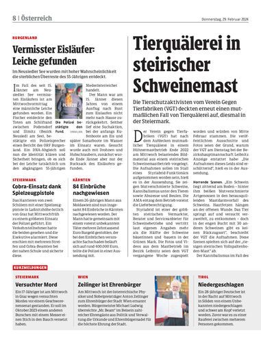 Die Tierschutzaktivisten vom Verein Gegen Tierfabriken (VGT) deckten erneut einen mutmaßlichen Fall von Tierquälerei auf, diesmal in der Steiermark.