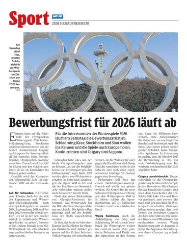 Für die Interessenten der Winterspiele 2026 läuft am Samstag die Bewerbungsfrist ab. Schladming/Graz, Stockholm und Sion wollen ins Rennen und die Spiele nach Europa holen. Konkurrenten sind Calgary und Sapporo.