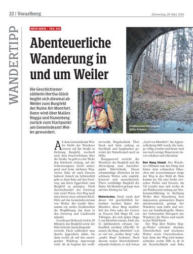 Die Geschichtenerzählerin Hertha Glück begibt sich diesmal ab Weiler zum Burgfeld der Ruine Alt-Montfort. Dann wird über Malärs Hogga und Hanenberg zurück zum Startpunkt am Gemeindeamt Weiler gewandert.