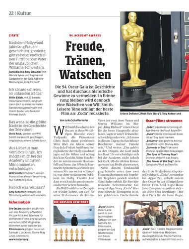 Die 94. Oscar-Gala ist Geschichte und hat durchaus historische Gewinne zu vermelden. In Erinnerung bleiben wird dennoch eine Watschen von Will Smith. Leisere Töne schlägt der beste Film an: „Coda“ reüssierte.
