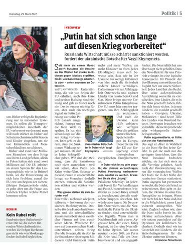Russlands Wirtschaft müsse schärfer sanktioniert werden, fordert der ukrainische Botschafter Vasyl Khymynets.
