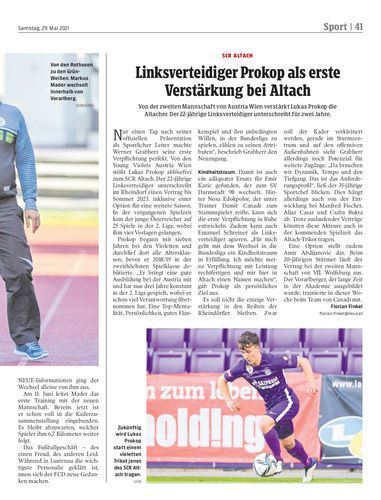 Von der zweiten Mannschaft von Austria Wien verstärkt Lukas Prokop die Altacher. Der 22-jährige Linksverteidiger unterschreibt für zwei Jahre.