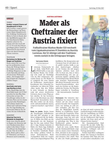 Fußballtrainer Markus Mader (53) wechselt vom Ligakonkurrenten FC Dornbirn zu Austria Lustenau. Der 53-Jährige soll den Traditionsverein zurück in die Erfolgsspur bringen.