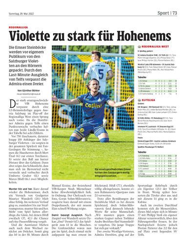 Die Emser Steinböcke werden vor eigenem Publikum von den Salzburger Violetten an den Hörnern gepackt. Durch den Last-Minute-Ausgleich von Telfs verpasst die Admira einen Dreier.