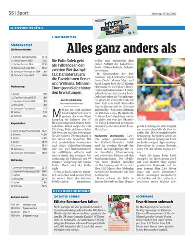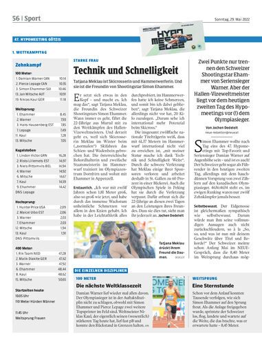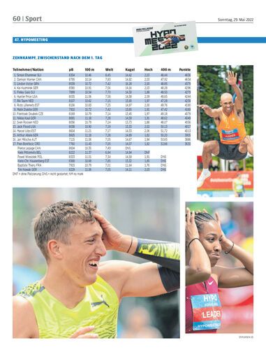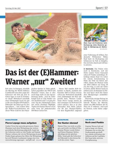 Zwei Punkte nur trennen den Schweizer Shootingstar Ehammer von Seriensieger Warner. Aber der Hallen-Vizeweltmeister liegt vor dem heutigen zweiten Tag des Hypomeetings vor (!) dem Olympiasieger.