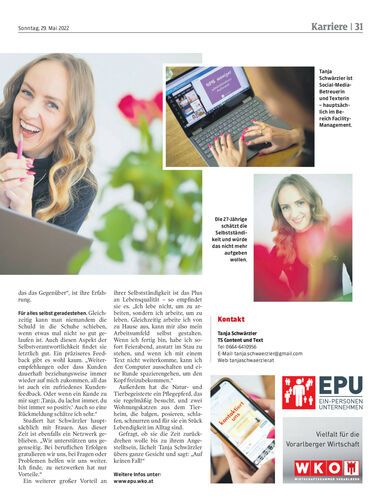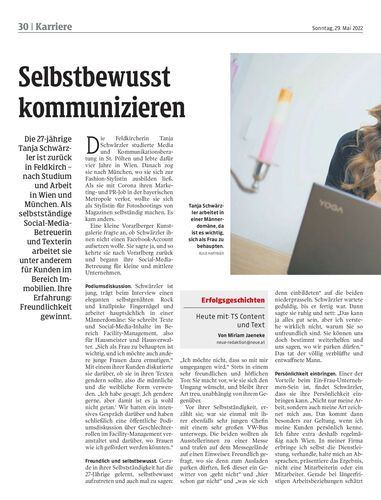 Die 27-jährige Tanja Schwärzler ist zurück in Feldkirch – nach Studium und Arbeit in Wien und München. Als selbstständige Social-Media-Betreuerin und Texterin arbeitet sie unter anderem für Kunden im Bereich Immobilien. Ihre Erfahrung: Freundlichkeit gewinnt.