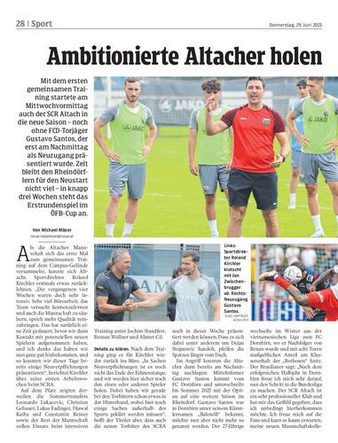 Mit dem ersten gemeinsamen Training startete am Mittwochvormittag auch der SCR Altach in die neue Saison – noch ohne FCD-Torjäger Gustavo Santos, der erst am Nachmittag als Neuzugang präsentiert wurde. Zeit bleibt den Rheindörflern für den Neustart nicht viel – in knapp drei Wochen steht das Erstrundenspiel im ÖFB-Cup an.