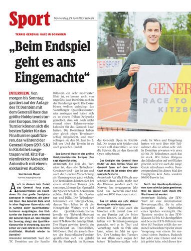Interview. Von morgen bis Sonntag gastiert auf der Anlage des TC Dornbirn mit dem Generali Race das größte Hobbytennisturnier Europas. Bei dem Turnier können sich die besten Spieler für das Finalturnier qualifizieren, das während der Generali Open (29.7.–5.8.) in Kitzbühel ausgetragen wird. Kitz-Turnierdirektor Alexander Antonitsch mit einem exklusiven Ausblick.
