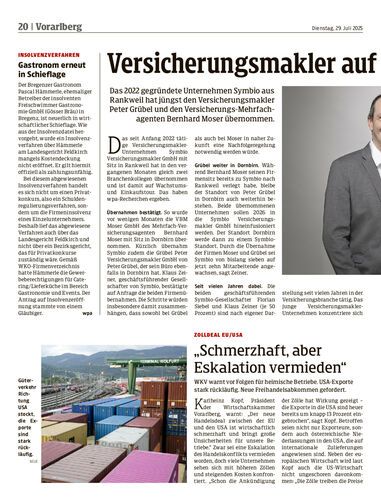 Das 2022 gegründete Unternehmen Symbio aus Rankweil hat jüngst den Versicherungsmakler Peter Grübel und den Versicherungs-Mehrfachagenten Bernhard Moser übernommen.