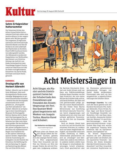 Acht Sänger, ein Pianist und ein Streichquintett boten bei der Schubertiade den Freundinnen und Freunden des Ensemblegesangs ein Fest. Das Quatuor Modigliani begeisterte mit Werken von Joaquin Turina, Maurice Ravel und Schubert.
