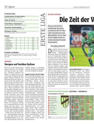 Heute (18.30 Uhr) empfängt Austria Lustenau den FC Wacker Innsbruck zum Westderby. Es ist das letzte Spiel unter Interimstrainer Daniel Ernemann.