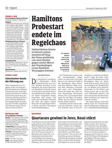Valtteri Bottas feierte in Sotschi seinen neunten GP-Sieg, der Finne profitierte von zwei Strafen gegen seinen Mercedes-Teamkollegen Lewis Hamilton. Verstappen Zweiter.