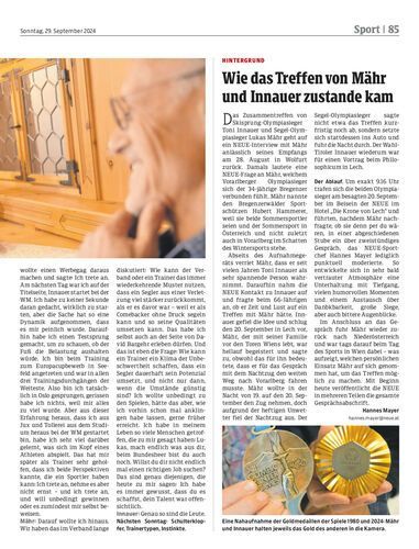 Gespräch. Auf Initiative der NEUE trafen sich am 20. September im Hotel „Die Krone von Lech“ die beiden Vorarlberger Olympiasieger Toni Innauer (66) und Lukas Mähr (34). Die beiden Champions waren sich davor noch nie begegnet, trotzdem entwickelte sich in Minutenschnelle ein angeregtes Gespräch in privater Atmosphäre, das von NEUE-Sportchef Hannes Mayer begleitet und punktuell moderiert wurde. Teil eins des über zweistündigen, denkwürdigen Gesprächs.