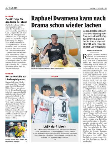 Gegen Hartberg brach Linz-Stürmer Raphael Dwamena im ÖFB-Cup zusammen. Da sein Defibrillator viermal eingriff, war er nie in akuter Lebensgefahr.