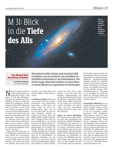Die meisten hellen Sterne sind maximal 1000 Lichtjahre von uns entfernt. Ein Lichtfleck im Sternbild Andromeda ist ein Rekordhalter. Von freiem Auge erkennbar eröffnet er einen Blick zu neuen Welten in ungeahnten Entfernungen.