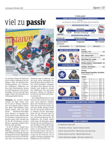 Spielbericht. Die Bemer Pioneers Vorarl-berg verlieren vor nur 1393 Zuschauern in der Vorarlberghalle ein enttäuschendes Westderby mit 2:3 gegen die Haie aus Innsbruck.