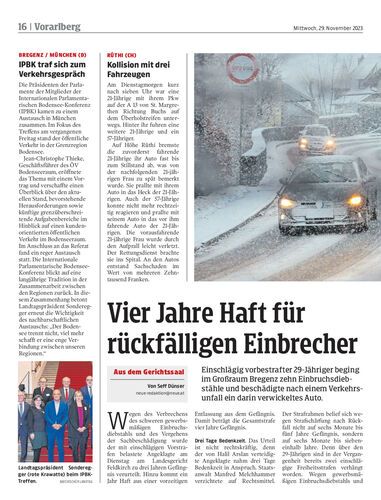 Einschlägig vorbestrafter 29-Jähriger beging im Großraum Bregenz zehn Einbruchsdiebstähle und beschädigte nach einem Verkehrsunfall ein darin verwickeltes Auto.