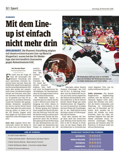 Spielbericht. Die Pioneers Vorarlberg zeigten mit einem extrem kurzen Line-up Moral in Klagenfurt, waren bei der 2:6-Niederlage aber letztendlich chancenlos gegen Rekordmeister KAC.