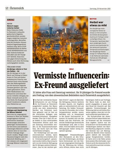 31 Jahre alte Frau seit Sonntag vermisst. Ihr 31-jähriger Ex-Freund wurde am Freitag von den slowenischen Behörden nach Österreich ausgeliefert.