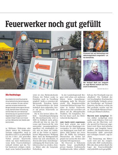 Feuerwerk. Ob heuer im privaten Rahmen Raketen zu Silvester gezündet werden dürfen, entscheiden die Bürgermeister. Die Gesamtsituation wirkt sich massiv auf den Verkauf von Böllern und Co. aus. Seiten 10/11 Roland Paulitsch