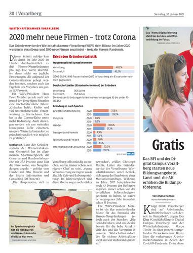 Das Gründerservice der Wirtschaftskammer Vorarlberg (WKV) zieht Bilanz: Im Jahre 2020 wurden in Vorarlberg rund 2100 neue Firmen gegründet – trotz der Corona-Pandemie.