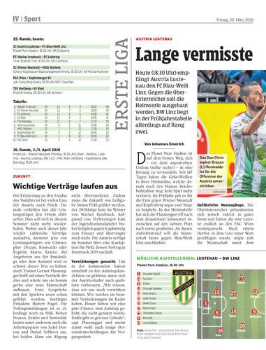 Heute (18.30 Uhr) empfängt Austria Lustenau den FC Blau-Weiß Linz. Gegen die Oberösterreicher soll die Heimserie ausgebaut werden, BW Linz liegt in der Frühjahrstabelle allerdings auf Rang zwei.