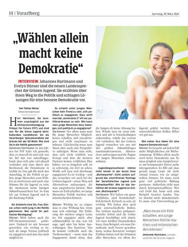Interview. Johannes Hartmann und Evelyn Dünser sind die neuen Landessprecher der Grünen Jugend. Sie erzählen über ihren Weg in die Politik und schlagen Lösungen für eine bessere Demokratie vor.