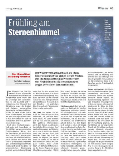 Der Winter verabschiedet sich. Die Sternbilder Orion und Stier stehen tief im Westen. Das Frühlingssternbild Löwe beherrscht den Abendhimmel. Die Morgenstunden zeigen bereits den Sommerhimmel.