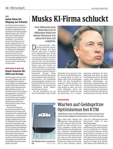 Tech-Milliardär Elon Musk lässt für 45 Milliarden Dollar die Online-Plattform X in seiner KI-Firma xAI aufgehen.