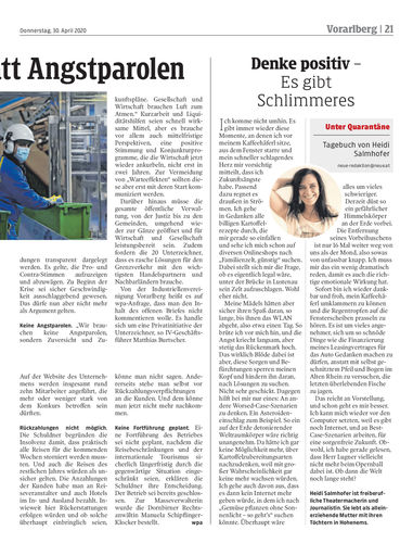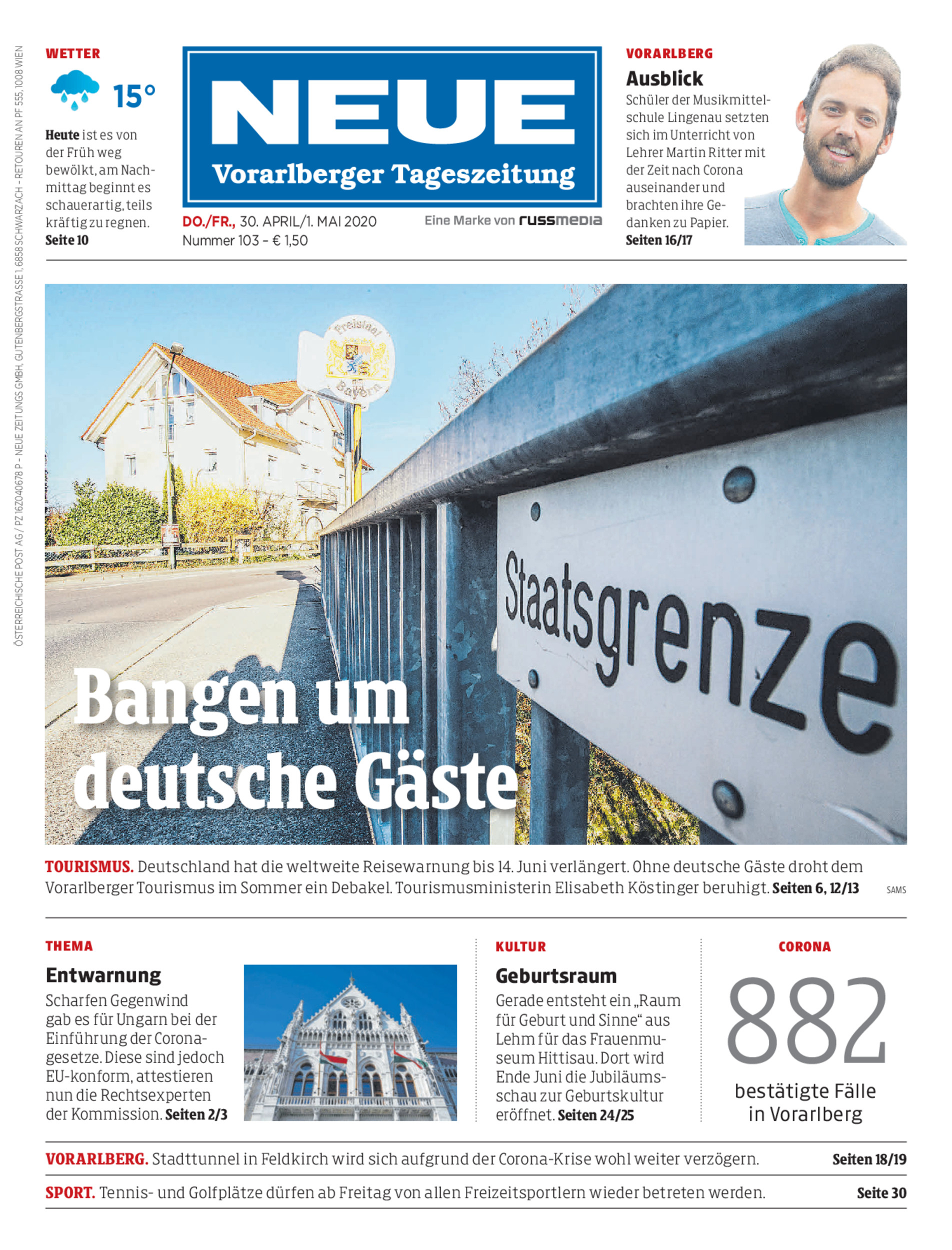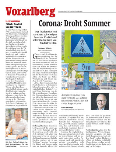 Tourismus. Deutschland hat die weltweite Reisewarnung bis 14. Juni verlängert. Ohne deutsche Gäste droht dem Vorarlberger Tourismus im Sommer ein Debakel. Tourismusministerin Elisabeth Köstinger beruhigt. Seiten 6, 12/13 Sams