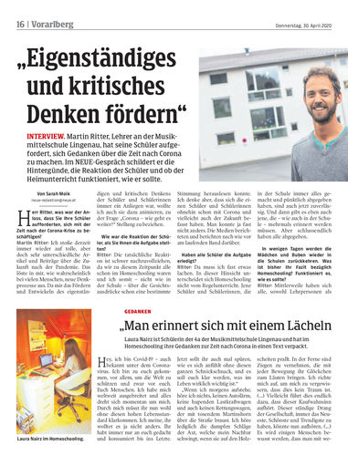 Interview. Martin Ritter, Lehrer an der Musikmittelschule Lingenau, hat seine Schüler aufgefordert, sich Gedanken über die Zeit nach Corona zu machen. Im NEUE-Gespräch schildert er die Hintergünde, die Reaktion der Schüler und ob der Heimunterricht funktioniert, wie er sollte.