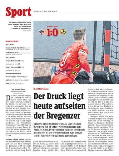 Bregenz empfängt heute (20.20 Uhr) in Spiel zwei der Best-of-three-Viertelfinalserie den Alpla HC Hard. Die Bregenzer müssen gewinnen, ansonsten ist der Rekordmeister zum achten Mal in Folge im Viertelfinale gescheitert.