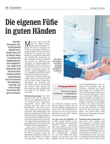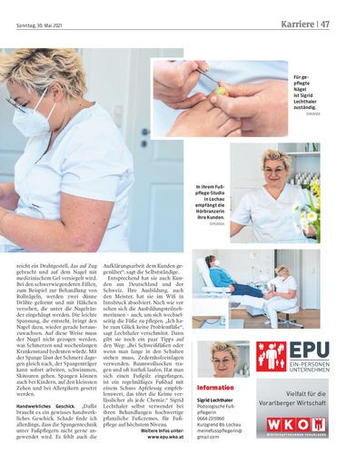 Die Ein-Personen-Unternehmerin Sigrid Lechthaler hat sich in ihrem Haus in Lochau ein Fußpflegestudio eingerichtet. Jeder Fuß bekommt hier höchste Aufmerksamkeit – spezialisiert hat sie sich auf die Spangentechnik, um etwa eingewachsene Nägel zu richten.