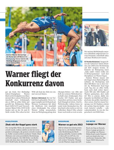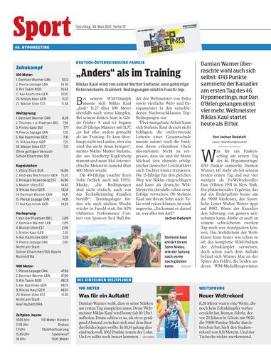 Damian Warner überraschte wohl auch sich selbst: 4743 Punkte sammelte der Kanadier am ersten Tag des 46. Hypomeetings, nur Dan O’Brien gelangen einst vier mehr. Weltmeister Niklas Kaul startet heute als Elfter.