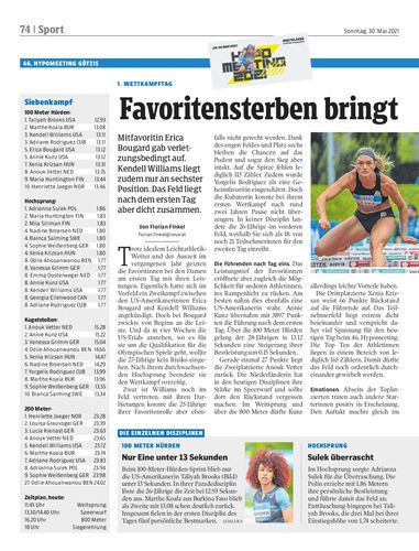 Mitfavoritin Erica Bougard gab verletzungsbedingt auf. Kendell Williams liegt zudem nur an sechster Position. Das Feld liegt nach dem ersten Tag aber dicht zusammen.