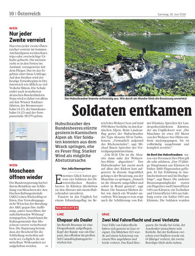 Hubschrauber des Bundesheeres stürzte gestern in Karnischen Alpen ab. Vier Soldaten konnten aus dem Wrack springen, ehe es Feuer fing. Starker Wind als mögliche Absturzursache.