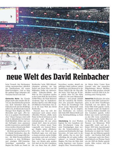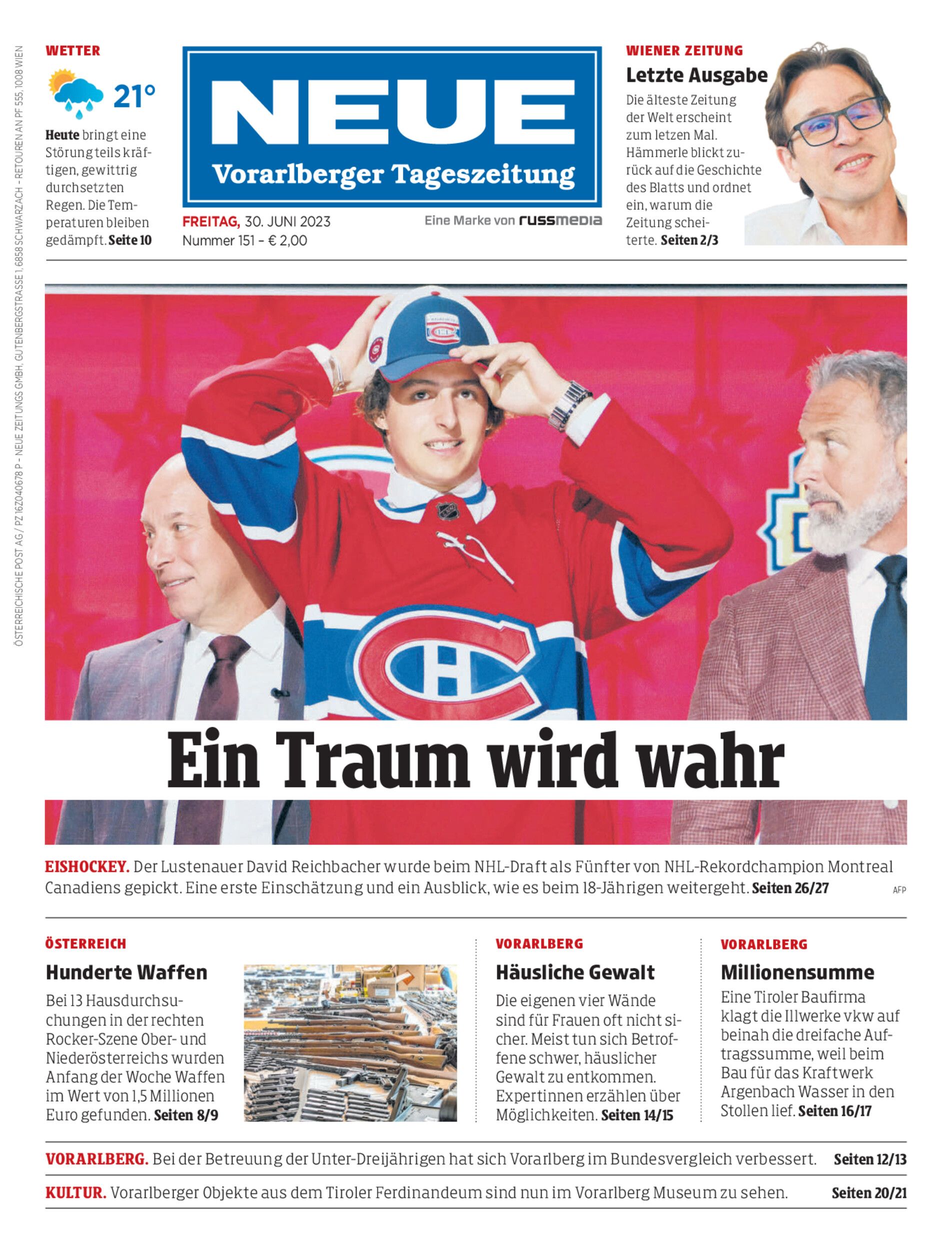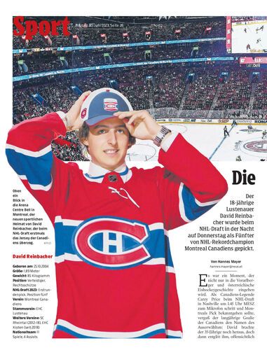 Der 18-jährige Lustenauer David Reinbacher wurde beim NHL-Draft in der Nacht auf Donnerstag als Fünfter von NHL-Rekordchampion Montreal Canadiens gepickt.