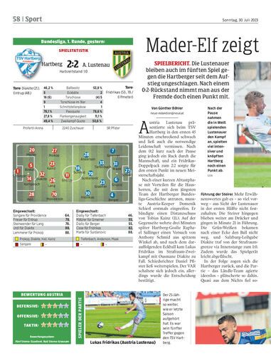 Spielbericht. Die Lustenauer bleiben auch im fünften Spiel gegen die Hartberger seit dem Aufstieg ungeschlagen. Nach einem 0:2-Rückstand nimmt man aus der Fremde doch einen Punkt mit.