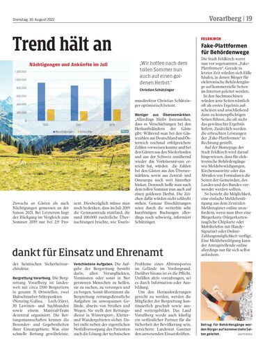 Die bisherige Sommersaison, speziell der Juli, war für den Vorarlberger Tourismus sehr erfreulich. Ankünfte und Nächtigungen sind steigend, aber weiterhin hinter Vorkrisenergebnis.