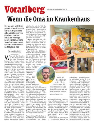 Der Mangel an Pflegepersonal betrifft nicht nur die Pflegeheime. Johannes Gasser von den Neos möchte mit einer Anfrage herausfinden, welche Auswirkungen es auf das restliche Gesundheitssystem hat.