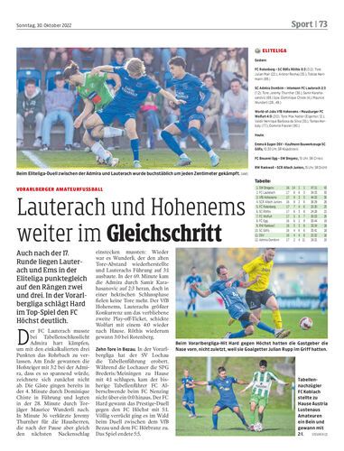 Auch nach der 17. Runde liegen Lauterach und Ems in der Eliteliga punktegleich auf den Rängen zwei und drei. In der Vorarlbergliga schlägt Hard im Top-Spiel den FC Höchst deutlich.